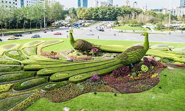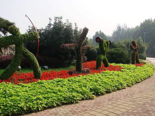 立体花坛采用仿真植物材料,制作出各种造型的仿真绿雕,周围搭配花草盆栽的使用,设计制作出具有观赏性的立体花坛。仿真绿雕造假成本相对于真植物绿雕的成本要低,成品方便移动,同时能够起到绿化周围环境的效果,使用寿命长,减少人工维护的成本。